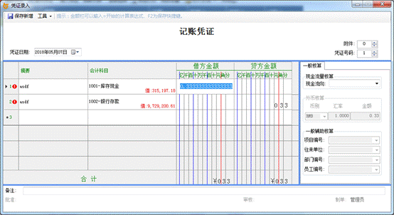 这种情况一般是1.0.29.256以前版本金额录入等式造成的(1.0.29.256以后版本修正了这个问题),比如录入:“=1/3”虽然显示是0.33,但实际是0.3333333333,当贷方录入0.33则会造成借贷不平衡。